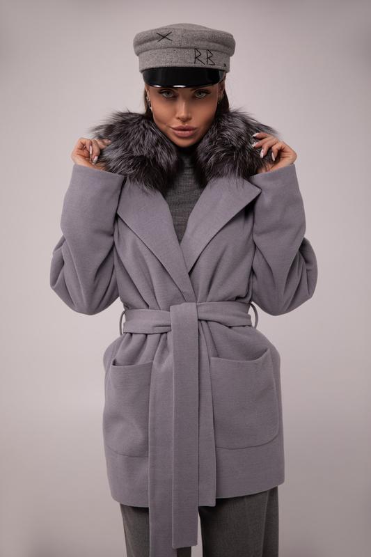 Кашемировое женское серое пальто с натуральным мехом песца чернобурки , размер s.m.l,xl