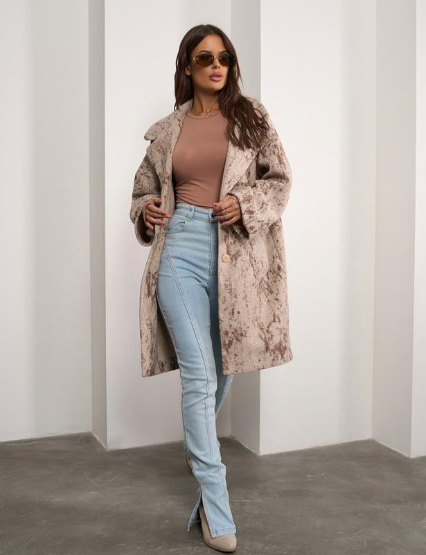 Бежевое шерстяное пальто кокон с принтом. Модель с английским воротником и длинными рукавами. Пальто свободного кроя с длиной ниже колен и карманами. Пальто без нижней подкладки.