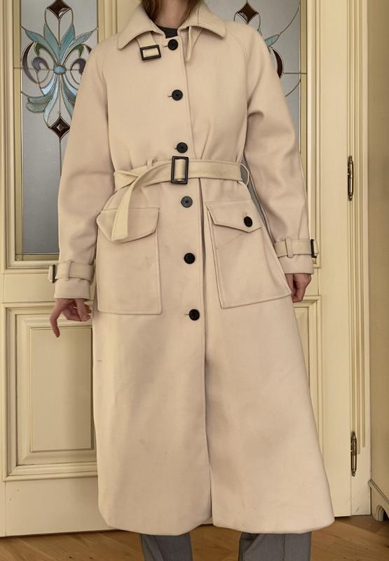 Стильное пальто кремового цвета, очень приятное в идеальном состоянии, носилось 2 раза, можно тушить как с ремешком так и без, лучше сядет на размер М