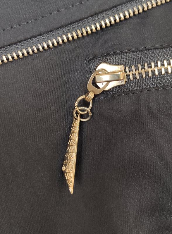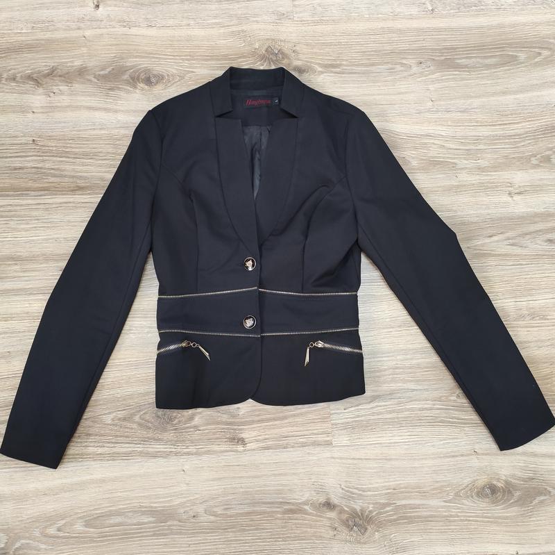 Замечательный женский жакет черного цвета с декоративными элементами: молнии, пуговицы, замочки (карманы обманки)