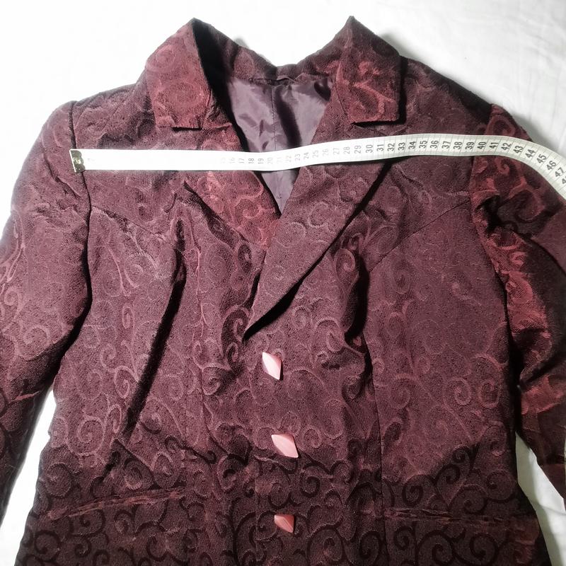 Классный женский пиджак. Темного бордового цвета с вышитым растительным принтом такого же цвета по изделию. Костюмна тканина. Красиво переливается на солнце узор.Пишите. Ответим на все дополнительные вопросы.