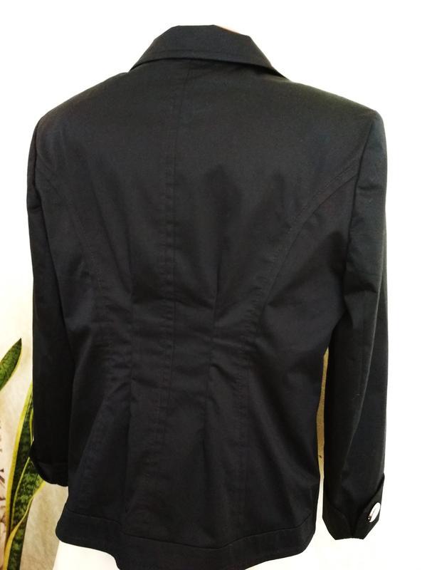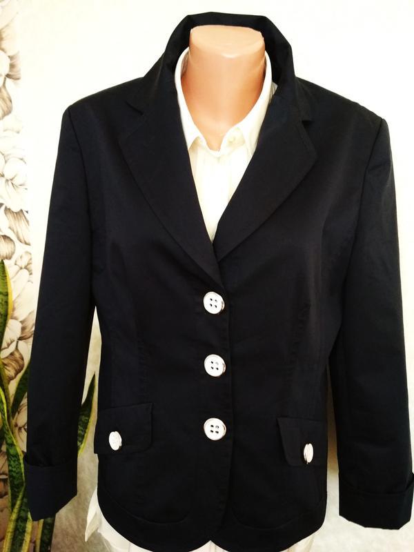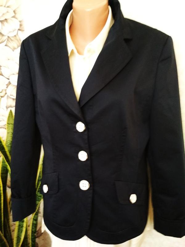 Очень красивый и стильный тёмно-синий двубортный жакет с контрастными пуговками, рукав с разрезом и подворотом. Притален, красиво ложится по фигуре, по выточкам красиво отстрочен. Плотный, хорошо держит форму. По рукавам, полочкам и до середины спинки на подкладке. Длина 60см, рукав чуть укорочен, 55см, плечи 42см, пог 50см, пот 45см, поб 54см.