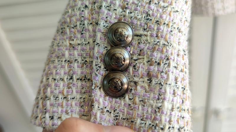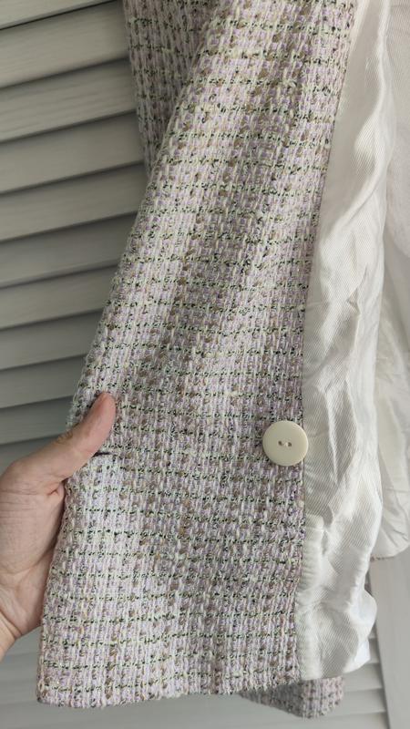 Твидовый жакет. Очень красивый. По фигуре. Надевался один раз. Почти новый. Подойдет на объем груди до 90 см. Да рост до 165 где-то. Замеры по желаниюдам.