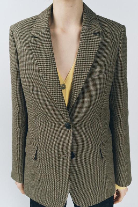 Блейзер из штапельной ткани с добавлением 25% шерсти. Прямоугольные лацканы и длинные рукава с разрезами и пуговицами на манжетах. Накладные карманы спереди. Подкладка. Застегивается на пуговицы спереди.
