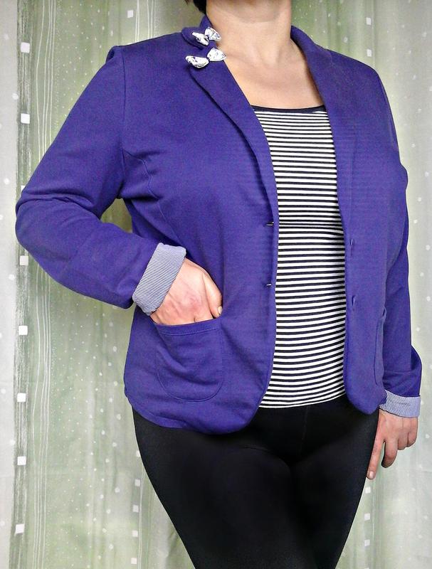 Милый летний жакетик из нежного натурального трикотажа красивого фиалкового оттенка. На рукавах отвороты, подшитые ситцем в фиолетово-белую полоску. На вороте милые бантики. Силуэт слегка приталенный. На бирке размер 20, подойдет на наш 54. Замеры: длина по спинке 63 см, обхват груди 118, талии 110, бедра 118. Обед на фото на параметры 115-92-117, рост 170 см - комфортно. Состояние отличное, без дефектов.