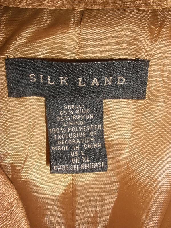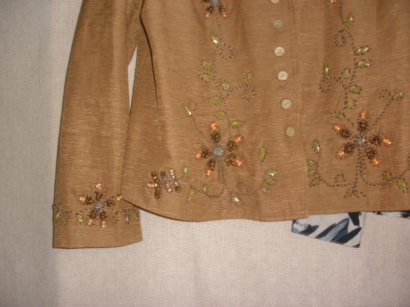 Светло-коричневый теплый цвет с легким золотистым отливом, подкладка в тон, красивая вышивка стеклярусом и бусинами, силуэт прямой , есть подплечики