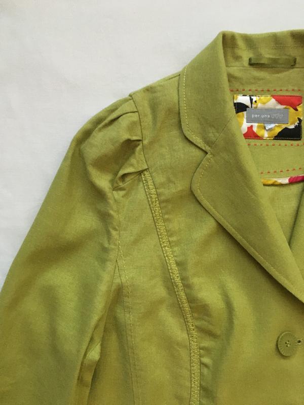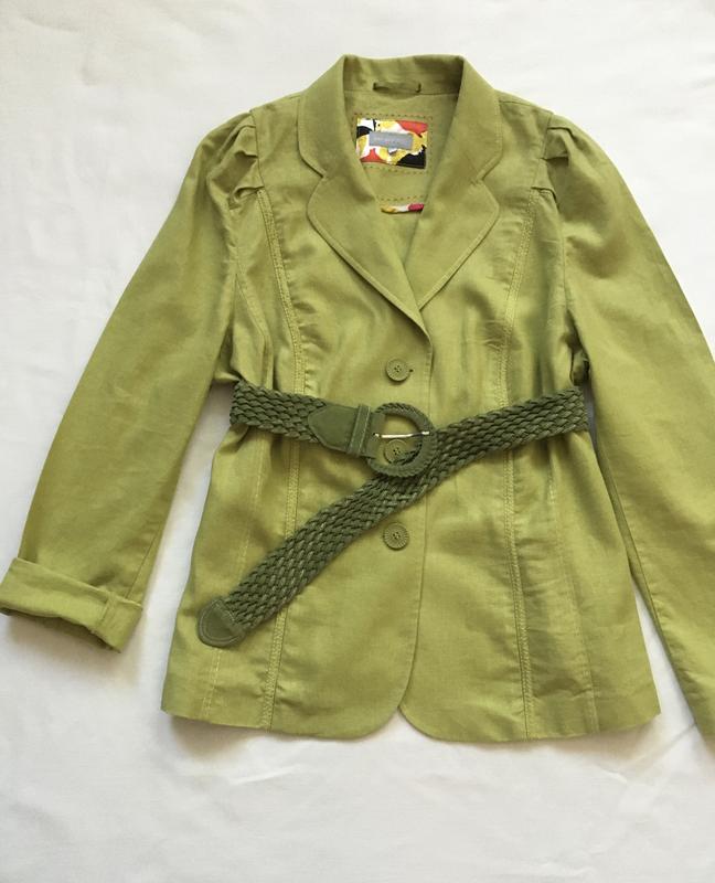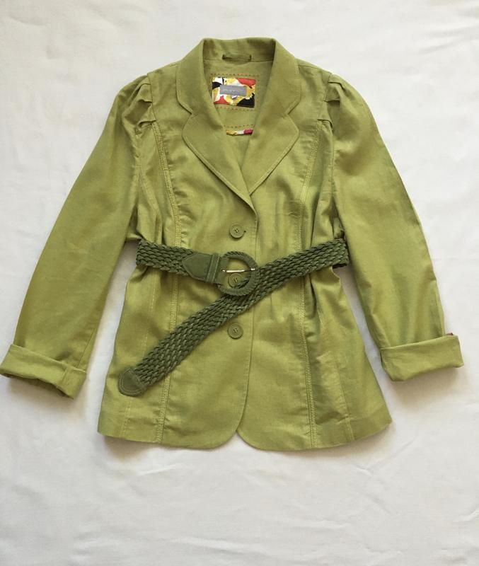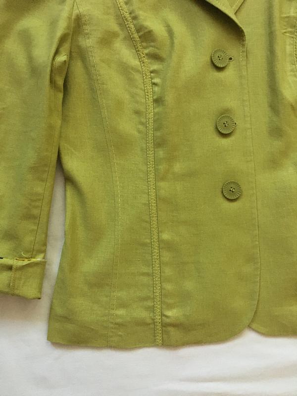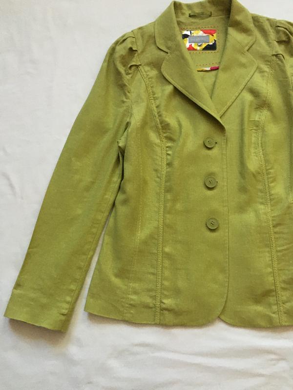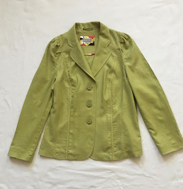 Яркий льняной лёгкий пиджак без подкладки. Актуальный яркий цвет раней молодой листвы. Красивая строчка спереди, рукав лёгким буфом красиво подчёркивает плечи! Размер 18, но маломерит на 14-16- XL-XXL Замеры: по груди-58/60 ( в натяжку), по талии-50/51, по низу-63, длина по спине-64, длина спереди-69.