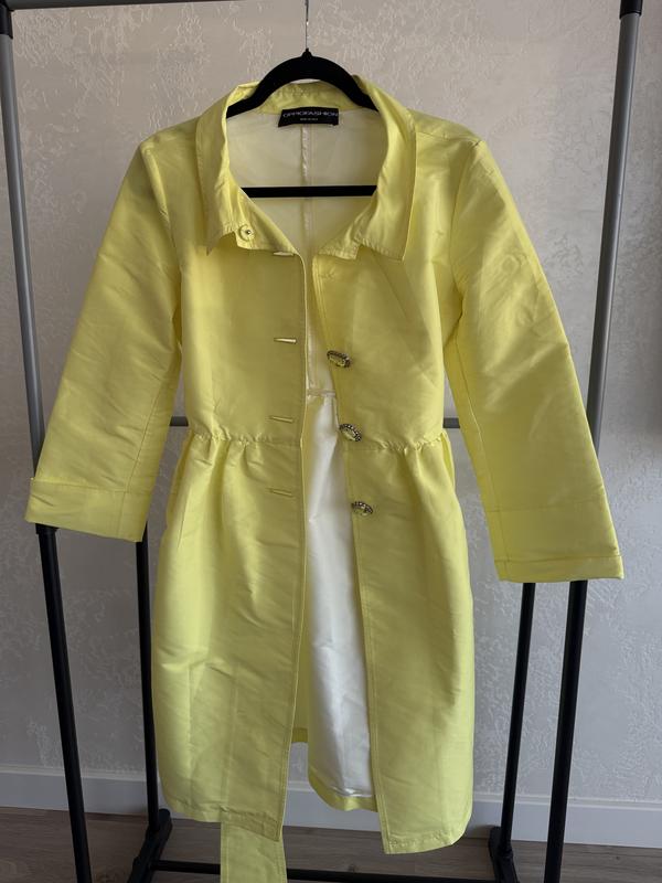 Бренд: Oppio Fashion Розмір: 44 IT (приблизно EUR 38 / US 28 / UK 10) Матеріал: • Верх: 100% поліестер • Підкладка: 97% бавовна, 3% еластан Стан: Відмінний, без дефектів Особливості: • Колір: Лимонно-жовтий • Приталений силует із куліскою на талії • Широкий знімний пояс у комплекті • Три декоративні гудзики зі стразами • Повноцінна підкладка кольору айворі • Вироблено в Італії (є всі внутрішні бірки) Заміри (виміряно вручну, в нерозтягнутому стані): • Довжина по спинці: приблизно 96 см • Довжина рукава: ~61 см • Плечі: 39 см • ПОГ (півобхват грудей): 47 см • ПОТ (талія по кулісці): регулюється, в середньому 38–41 см • ПОБ (стегна): до 51 см