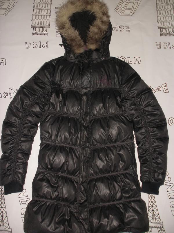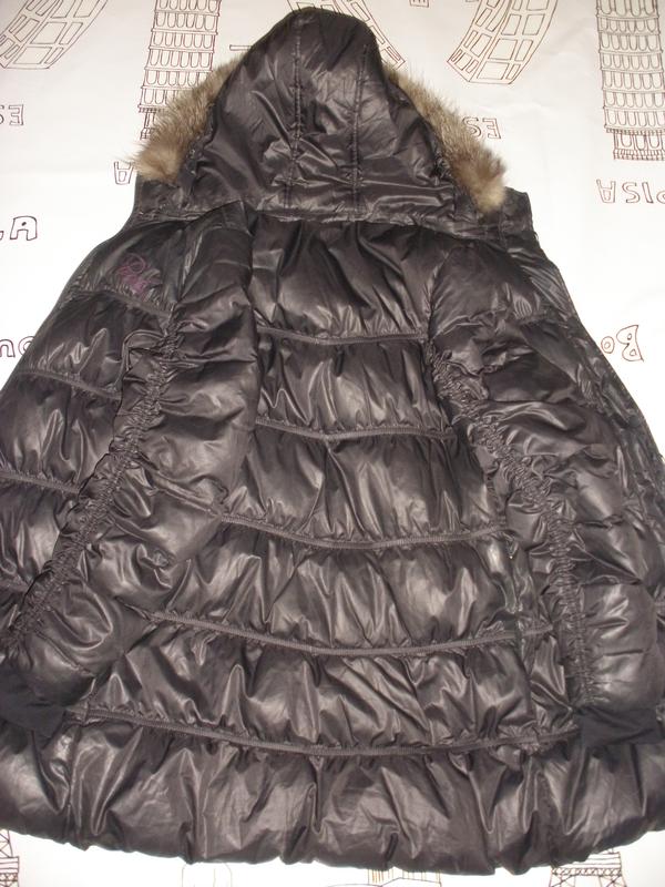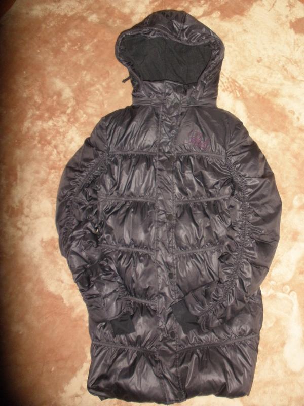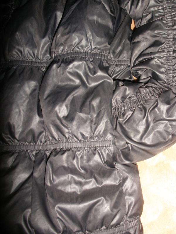 Цвет темно-серо-синий, наполнитель пух., по линии талии внутренняя кулиса, глубокий удобный капюшон, на рукавах внутренние манжеты.Длина рукава 62 см, длина по спинке 85 см, плечи 41 см, ПОГ 48 см, ПОТ 42 см.