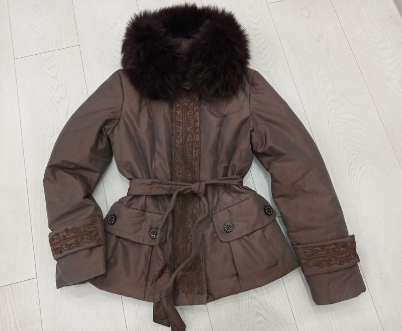 Куртка пуховик с натуральным мехом песца, б/у. Ткань хамелеон, немного переливается, воротник снимается, есть съёмный капюшон, также можно носить просто воротником стоечкой. Можно носить с поясом и без. Куртка на замке и дополнительно планочка ветрозащитная, на манжетах и планочке, что закрывает замок - вышивка. Наполнитель - пух, уже не такой пушистый и объемный как был изначально, больше как демисезон куртку использовала, на морозы мне холодно было (но я сильный мерзляк и на морозы укутываюсь по самый нос и желательно ещё и в одеяло) На воротнике с внутренней стороны есть небольшие потемнения от носки (внешне этого не видно), так же после стирки в районе воротника небольшие белые разводы (периодически могут появляться, после дополнительного полоскания уходят) - воротник с внутренней стороны на фото крупным планом. Размер S Замеры: длина от плеча 64 см, длина от воротника по замку 69 см, ширина под мышками 46 см, ширина пояса 42 см, ширина бедер 53 см, рукав от плечевого шва 63 см, плечи 35 см. Длина меха 60 см, ширина 16 см, длина подкладки меха 52 см, ширина 11 см Отправка укр, новой почтой или Мист экспресс