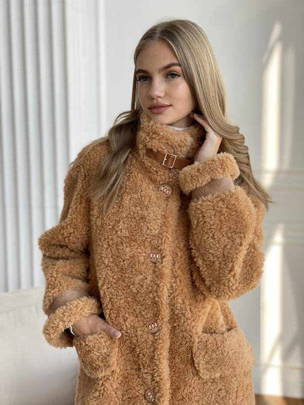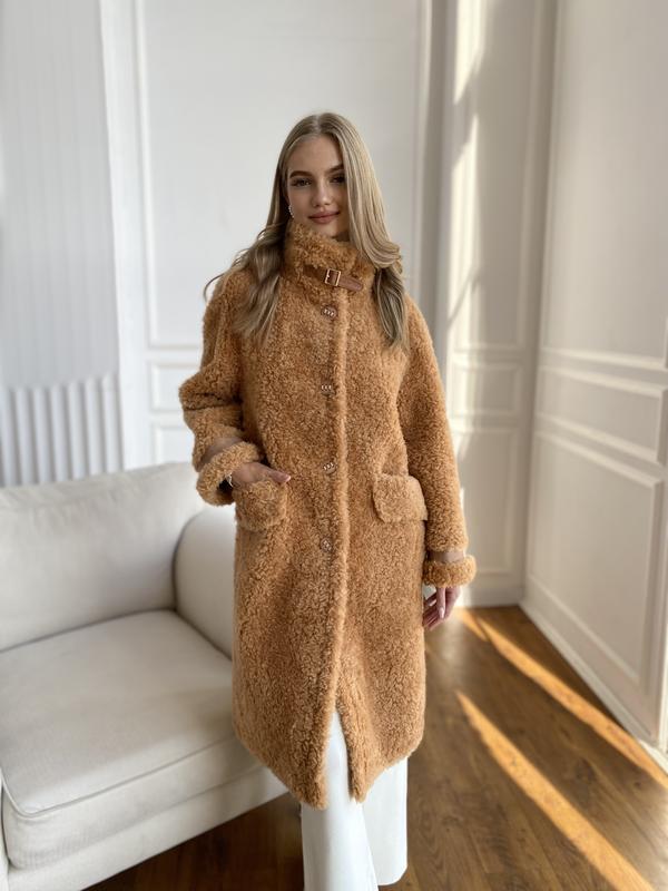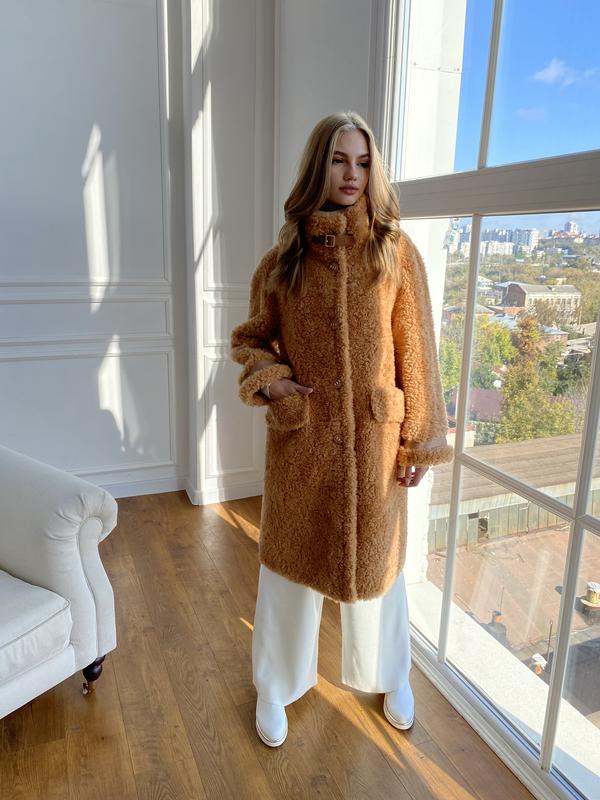 Нарядна бурштинова шубка, с закритим коміром і з довжиною рукава, яку можна регулювати