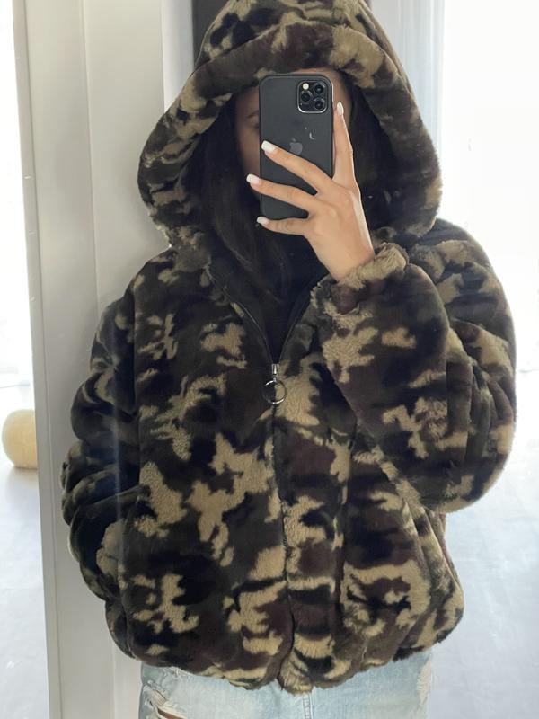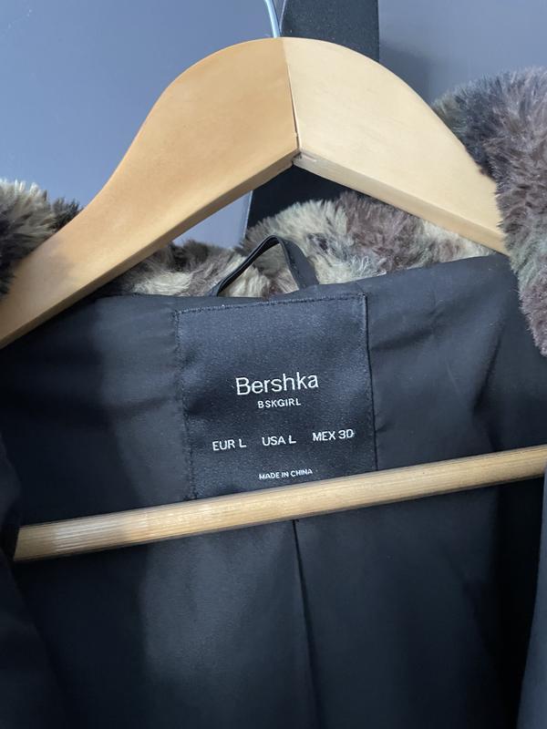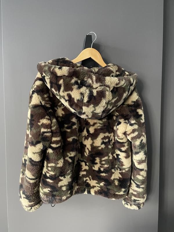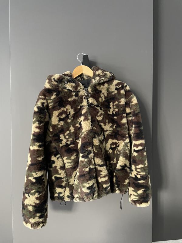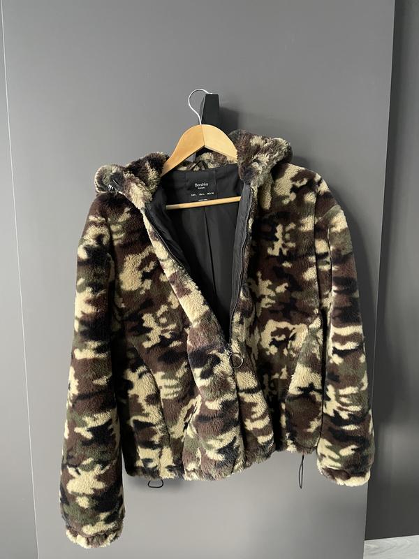 Эта куртка Bershka с принтованным камуфляжным коричневым искусственным мехом имеет завышенный крой, длинные рукава, застежку-молнию и капюшон.