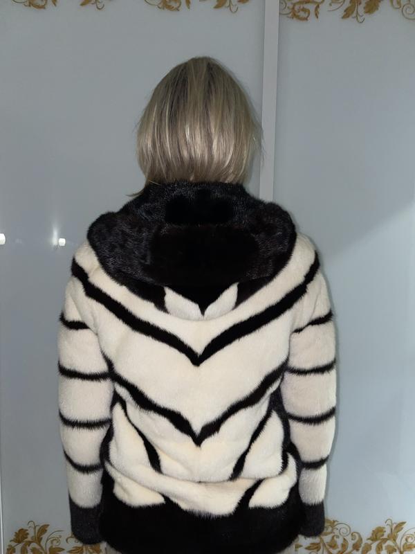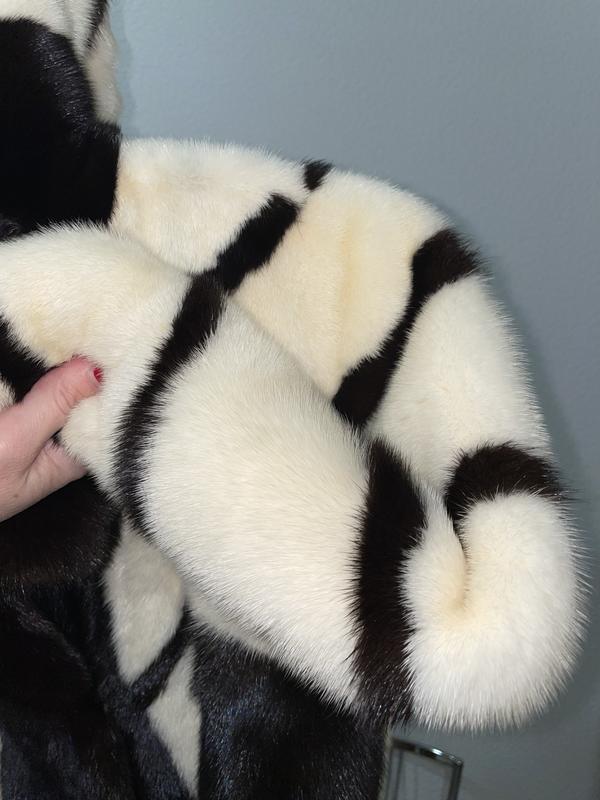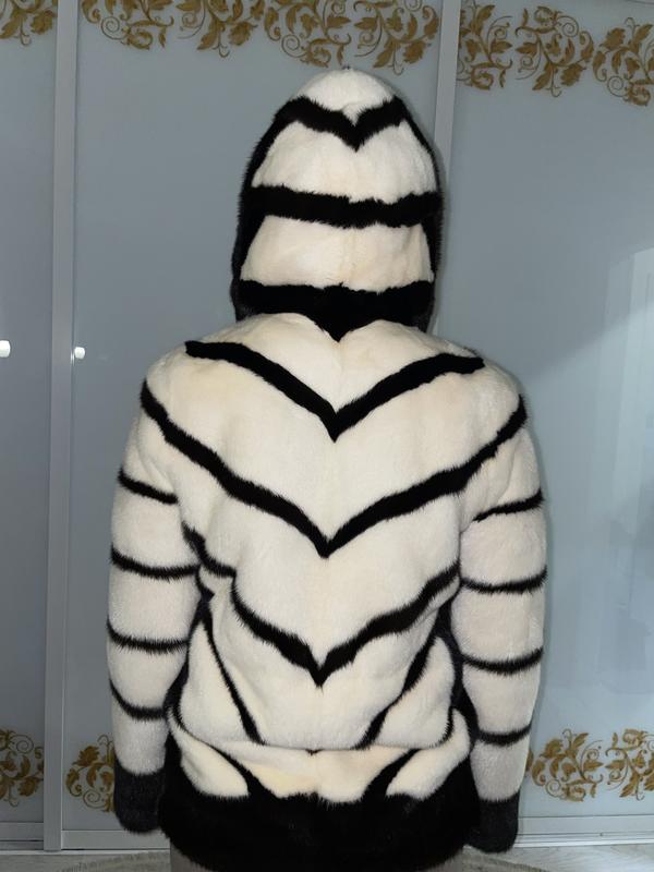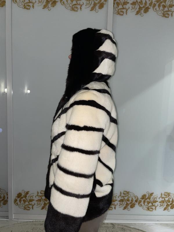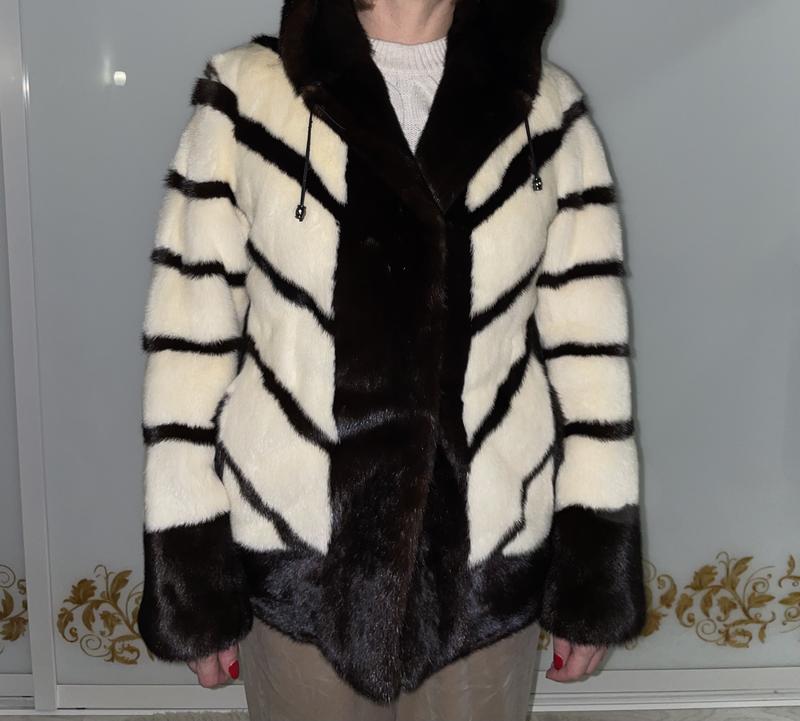 Шуба норка чорно-молочна у смужку з червоною підкладкою Також є капюшон та кишеніРозмір M/L
