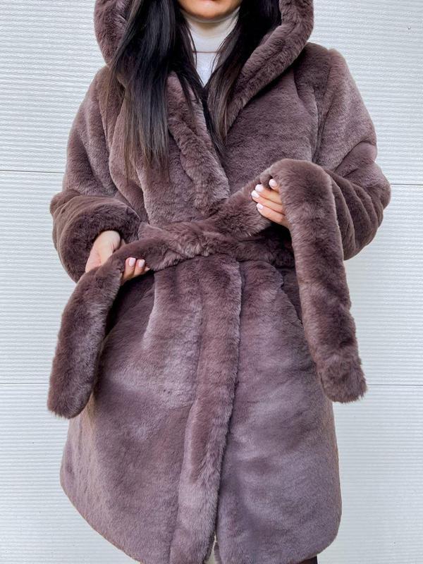 Шуба женская длинная зимняя мягкая с капюшоном и поясом