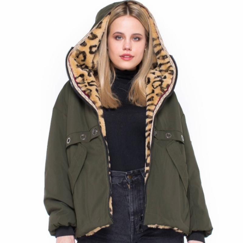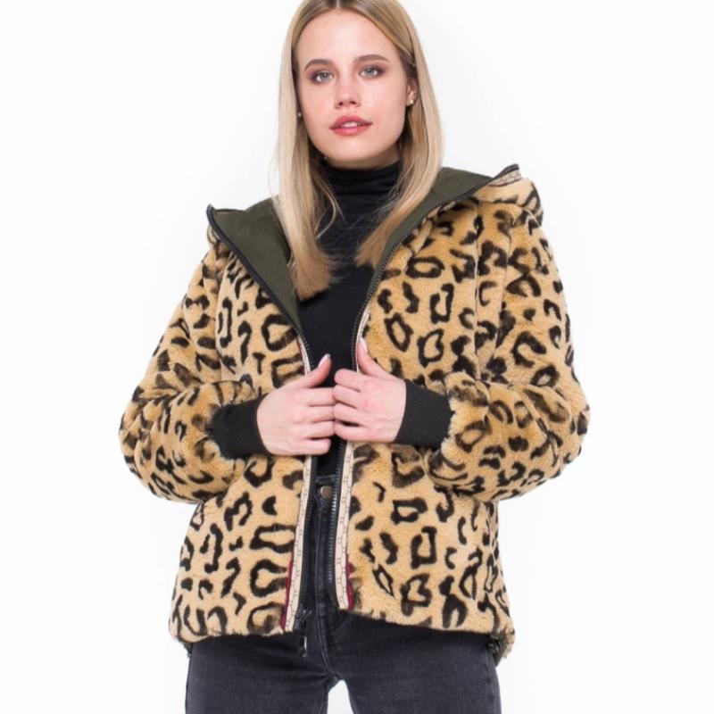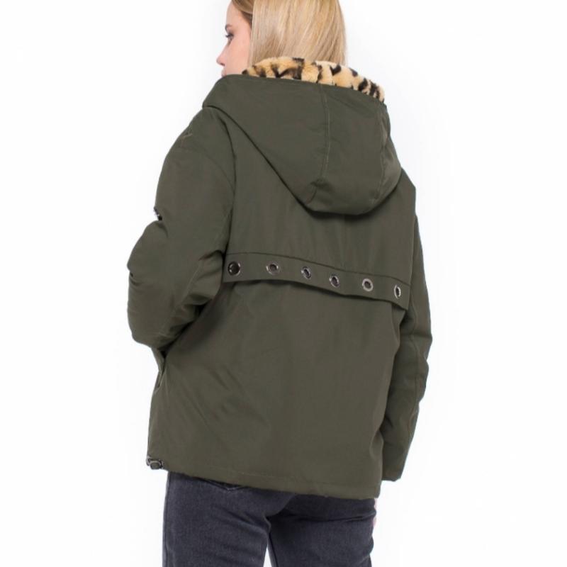 Верх куртки выполнен из плотной плащёвки (которая используется в изготовлении парок), а расцветку эко меха мы выбрали самую модную – леопард и белый.