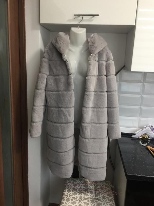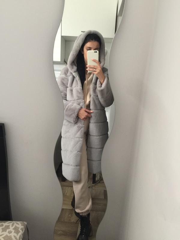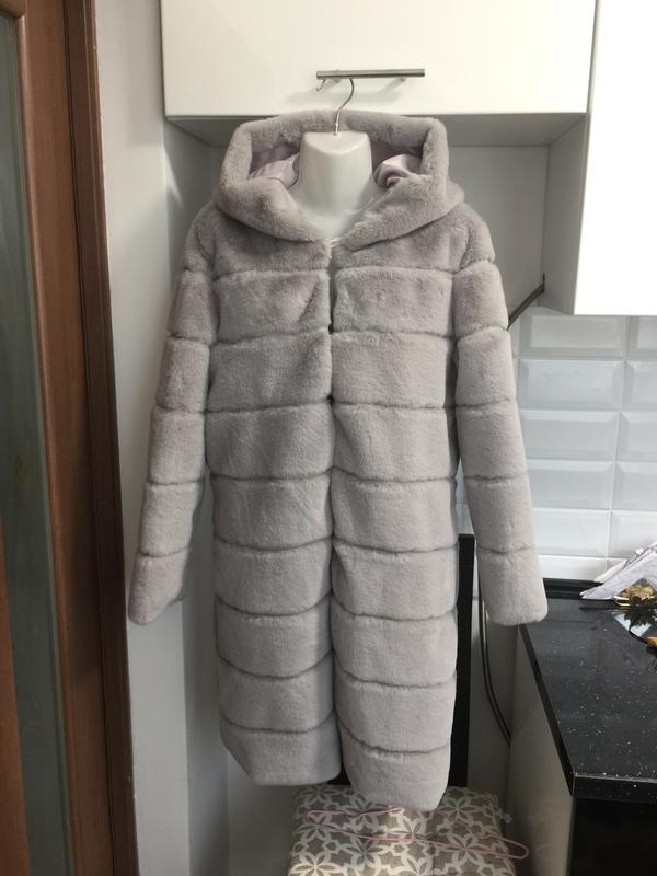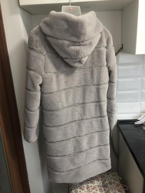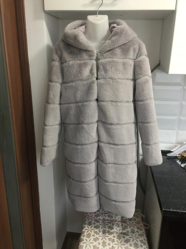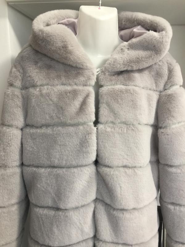 Еко-шуба з капішоном новенька є бічні кармани,застібається на гачки. Легка і м'ягенькаЙде на розмір S/M
