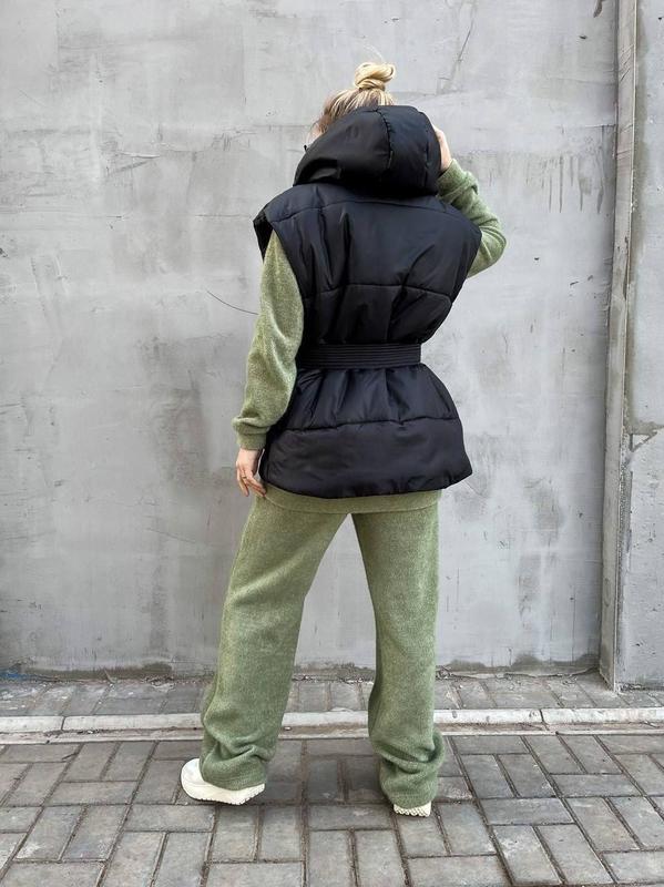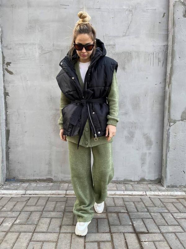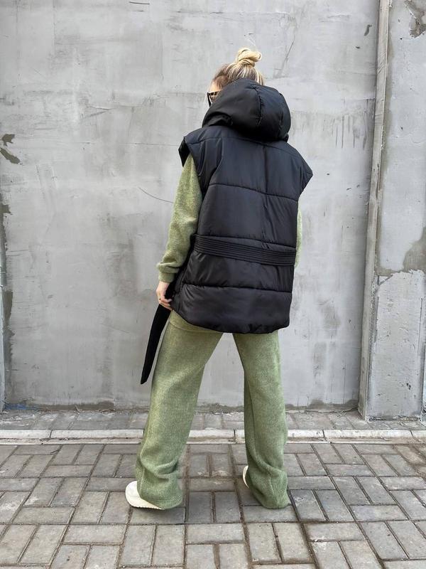 Жилетка с капюшоном, в комплекте есть пояс. Застёгивается на молнию и кнопки, есть карманы. Подкладка так же из плащевки.