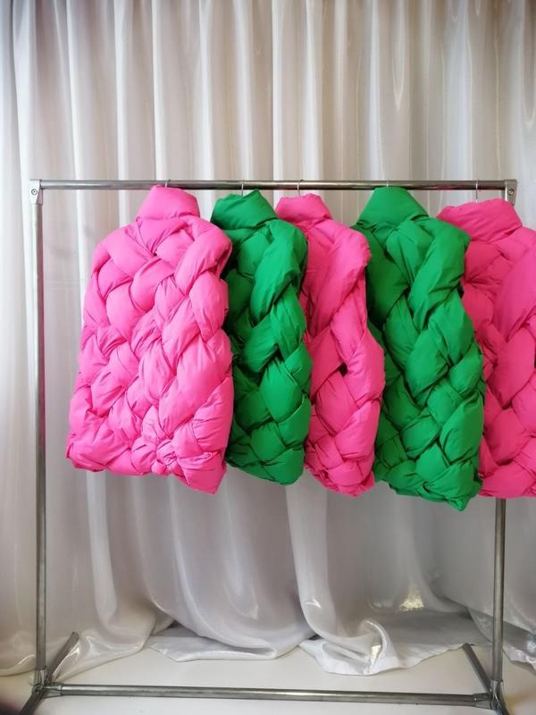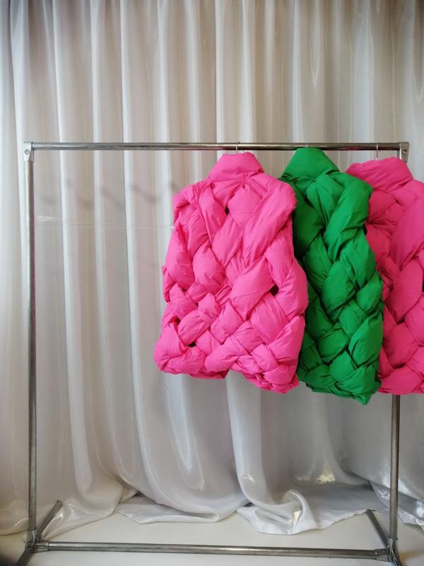 Крута стильна яскрава жилетка пуф 3d ефект палітурка насичений яскраво-рожевий колір фуксія і зелен