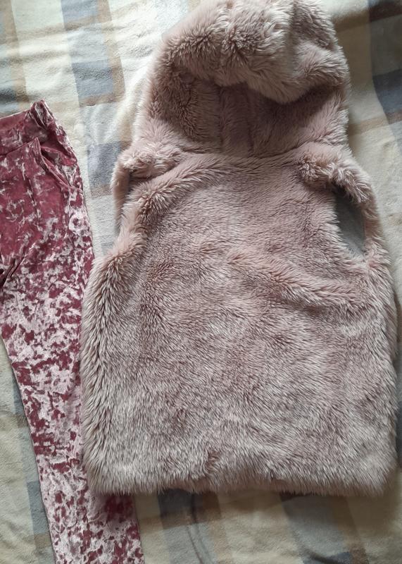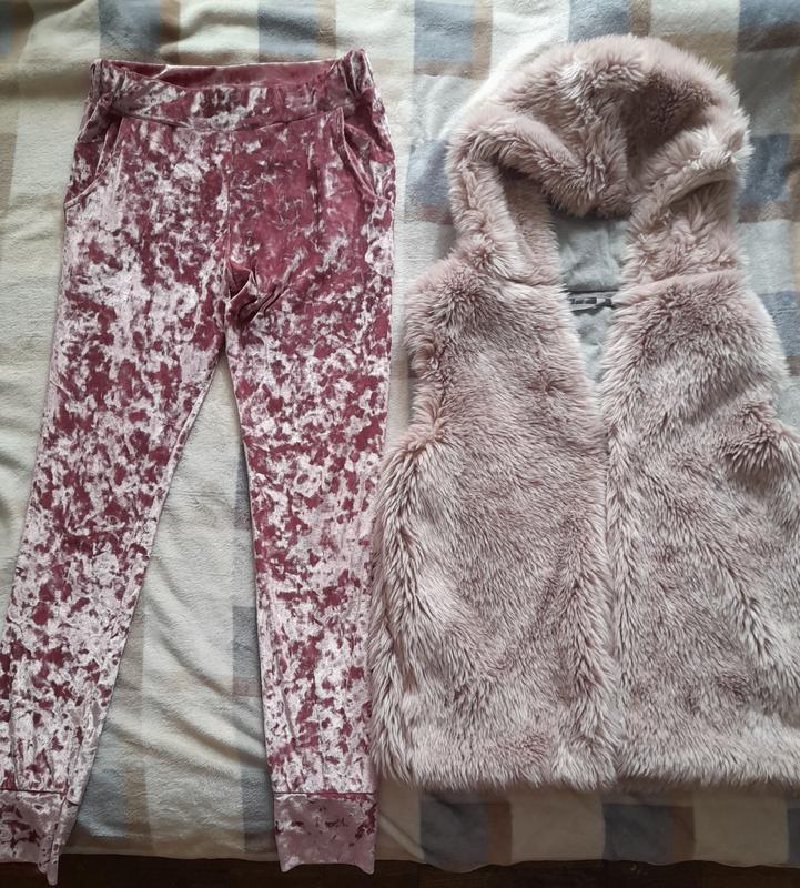 Бомбезная меховая жилетка next из искусственного меха ( эко мех) цвет светла розовый и велюровые штаны,жилетка и штаны одивались пару раз.