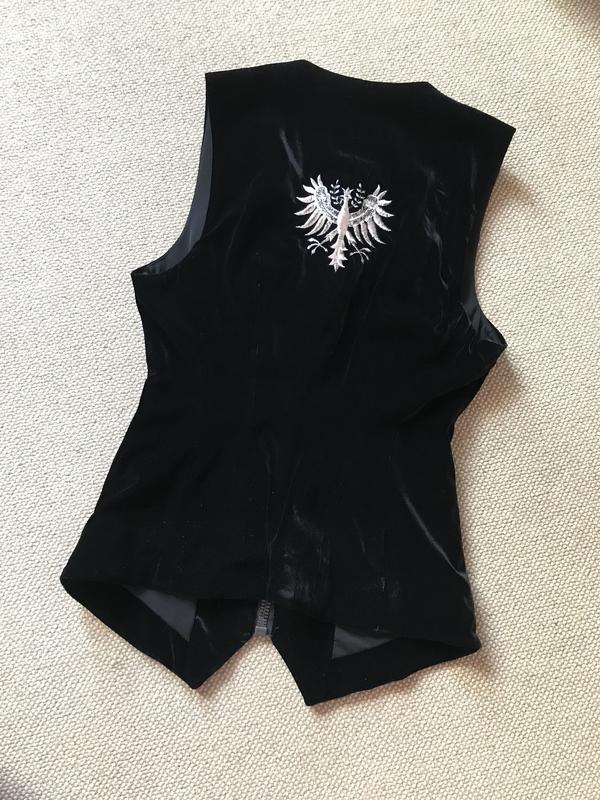 Фирменный жилет в новом состоянии. Одет был на фотосессию( на 1час), бархат натуральный стрейчевый на стрейчевой подкладке. В составе бархата 70% вискозы, шелк20% и эластан 10%. На спинке вышивка серебром. Смотрится оочень дорого и стильно. Одеть можно и на голое тело, так же можно и на рубашку, . И т д указан размер XS, но сядет лучше на S, ориентируйтесь по замерам.