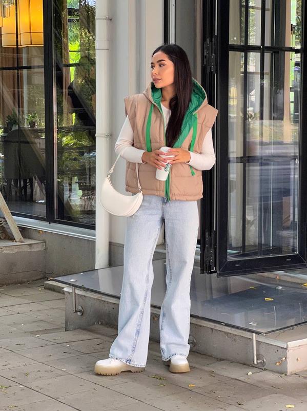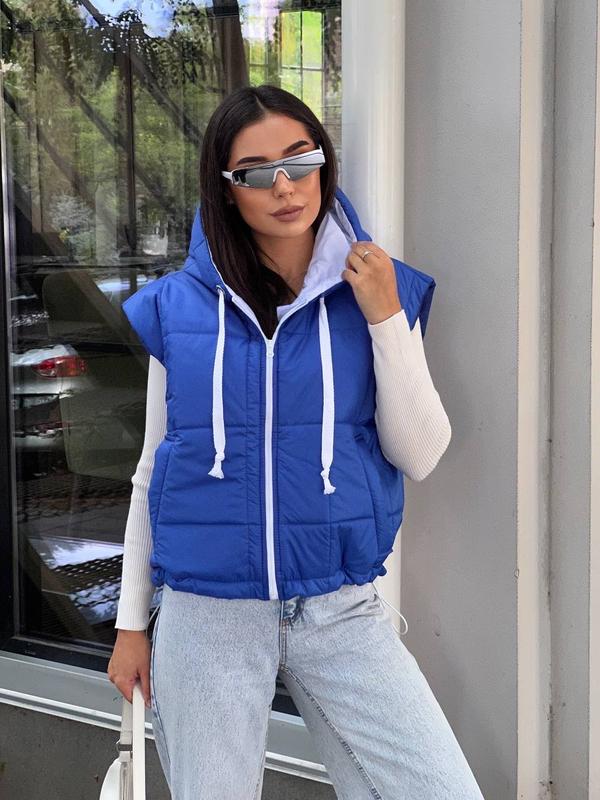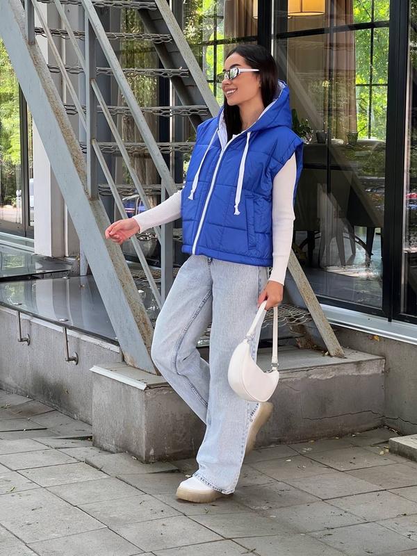 Объемная жилетка с капюшоном представлена в желаемых цветах с яркими акцентами.