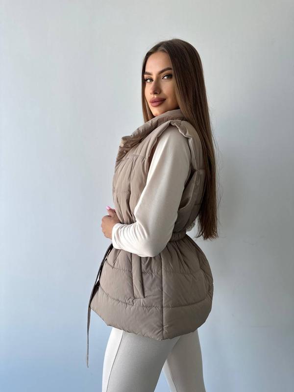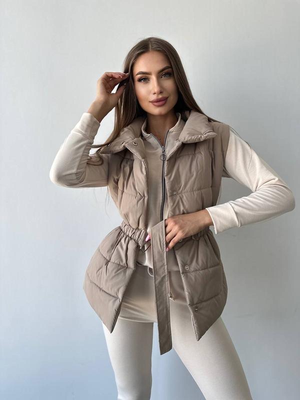 Жилетка застегивается на кнопки, в талии резинка, имеет карманы из основной ткани.