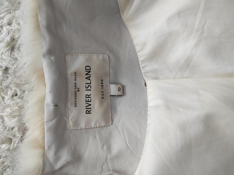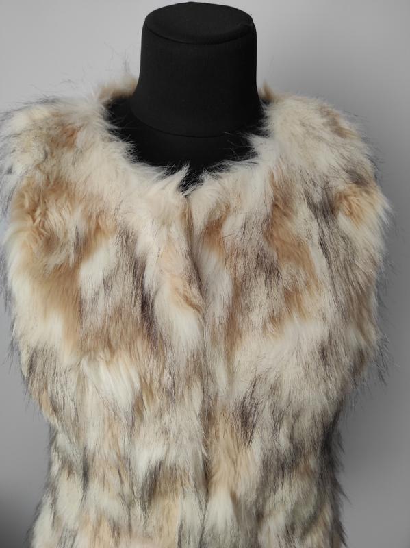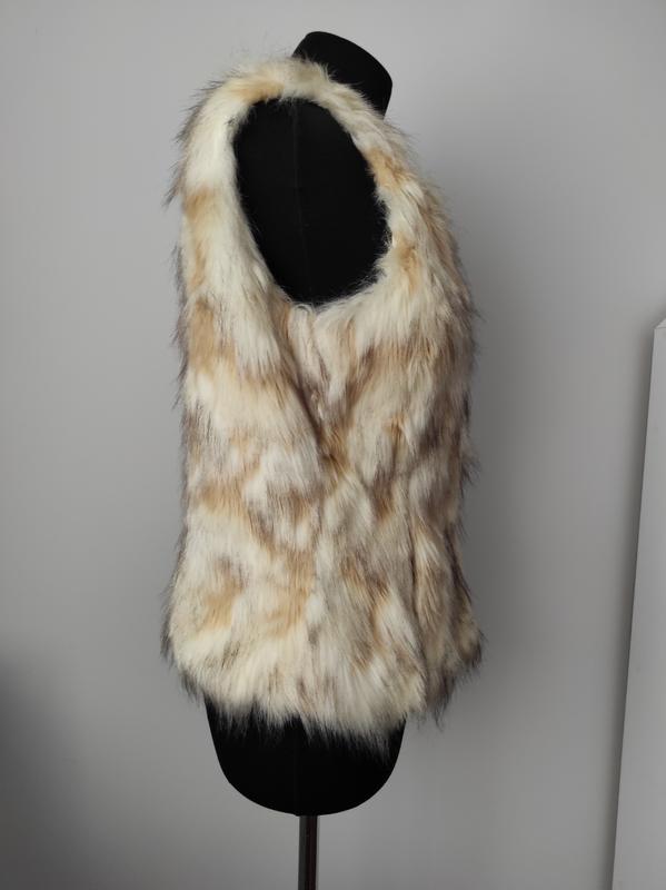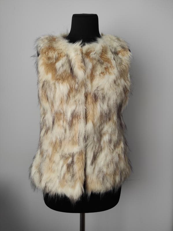Меховая жилетка 10 р от river islandРазмер - 10Цвет - белый кэмэл, меланжИскусственный мехНа подкладкеЗастёжка - 4 крючка, по все длине полочкиДлина по спинке -62 см,пог - 47 см,низ - 50 см,плечо - 8 см.