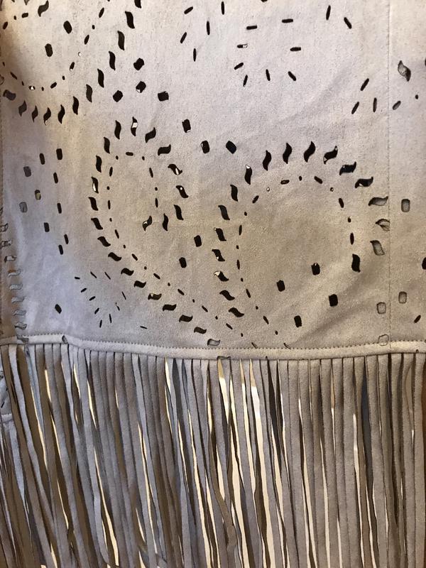 Предлагаю вашему вниманию очень красивый и стильный немного удлинённый жилет с бахромой по низу, цвет серо-бежевый...ткань под замшу (в живую смотрится гораздо интересней). Фирма ATMOSPHERE. Размер указан 8. Состав: 100% полиестер. Новый. ПОГ-45, длина с бахромой-86, без бахромы-67, плечи-37. ВНИМАНИЕ!!! При покупке три и более моих вещей-бесплатная доставка посылки Новой почтой. Удачных покупок.