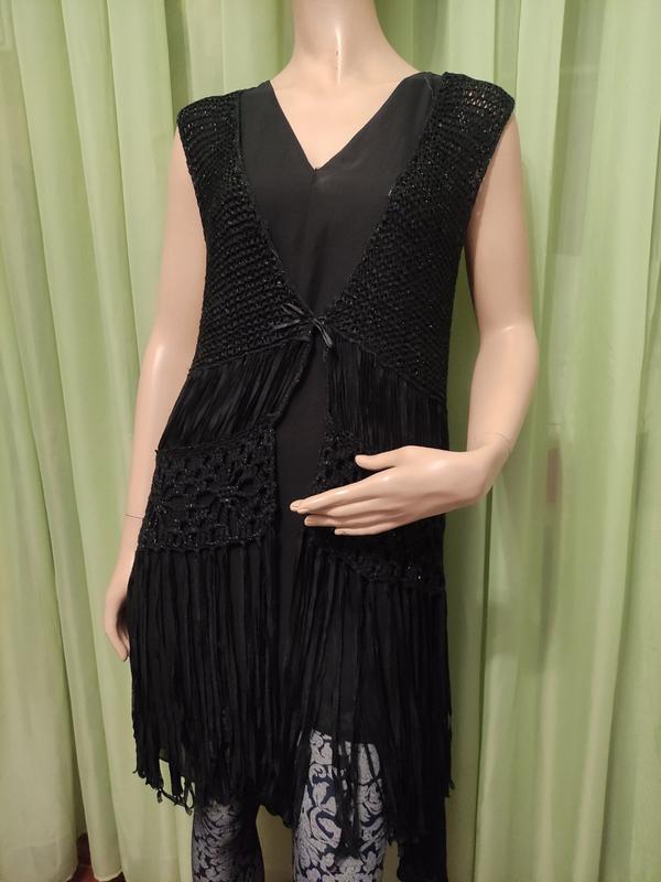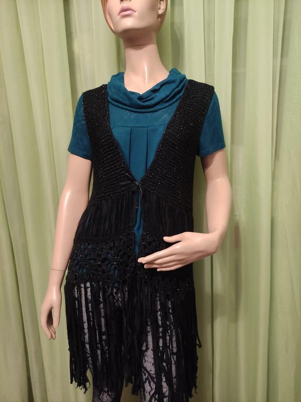 Жилет ажурный, удлиненный, черный с бахромой, "George", L, 63% акрил+ нейлон+ люрекс +полиэстер.Длина изделия с бахромой 95 см, полукруг груди50 см + (регулируется, на завязке).