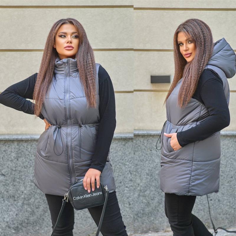 Стильная теплая жилетка с капюшоном 🔝🔝🔝 Удлиненный утепленный с капюшоном жилет 🆕🆕🆕 Идеален на весну и на зиму👌 #0012 Размеры 42-46,48-52,54-58 🔝🔝🔝Качество лучшее, поши идеальное (шевы равномерные) Ткань плащевки Лаке матовая, плотная не продувает, и не промокает Силикон 200, подкладка из такой же плащевки, качественно прошита, идет оверсайс, посадка идеальна👌 На талии кулиска регулируется 👍 Цвета черный, бело-молочный, фума, зеленый, мягко Замеры👉 42-46 Ог 106 от 106 об 108 Длина 85см 48-52 Ог 120 от 120 ОБ 124 см Длина 85 см 54-58 ОГ 134 от 134 ОБ 136 см Длина 86 см На модели размер 48-52 Ее параметры Ог 108 от85 об 110