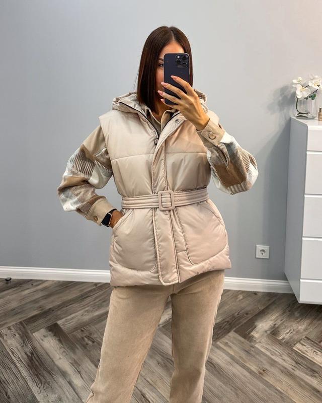 Стильний та універсальний жилет з капюшоном, та накладними кишенями,в комплекті пояс з пряжкою💐