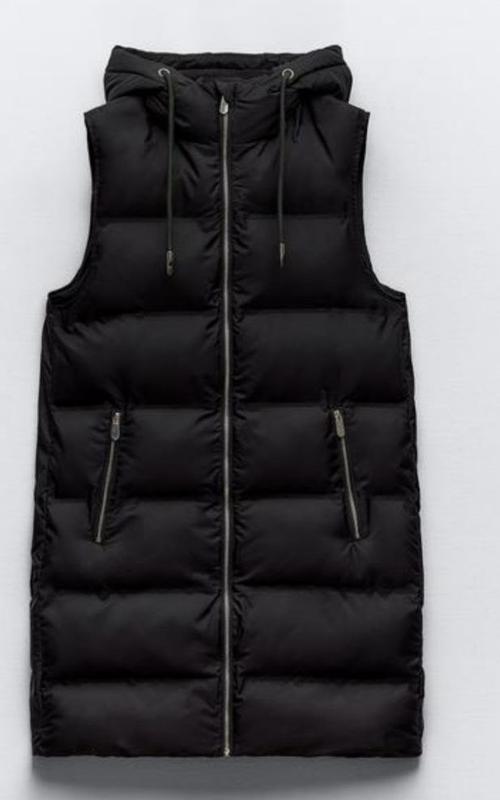 ZARA Водоотталкивающий ветрозащитный жилет, размер XS Цена 1800 грн. Длинный мягкий жилет с высоким воротником, регулируемым капюшоном на шнурках и рукавами с проймами. Передние карманы на молнии. Застежка спереди на металлическую молнию.
