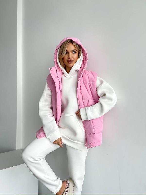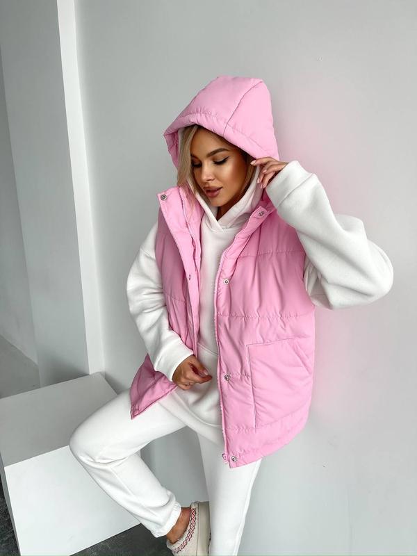 Жилетка из качественных материалов, с плотным наполнителем, на молнии и кнопках, с двумя рабочими карманами и капюшоном.