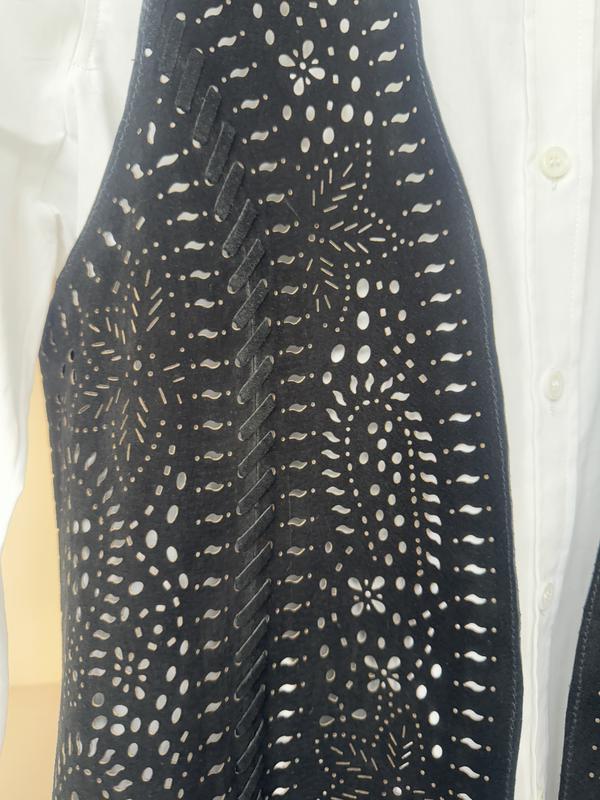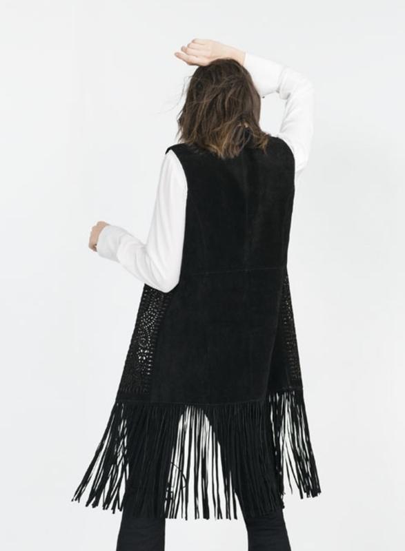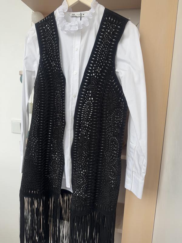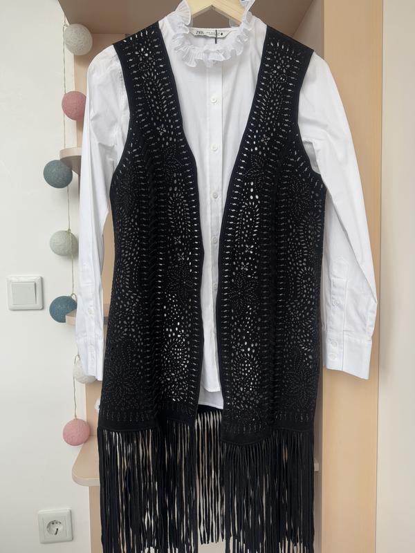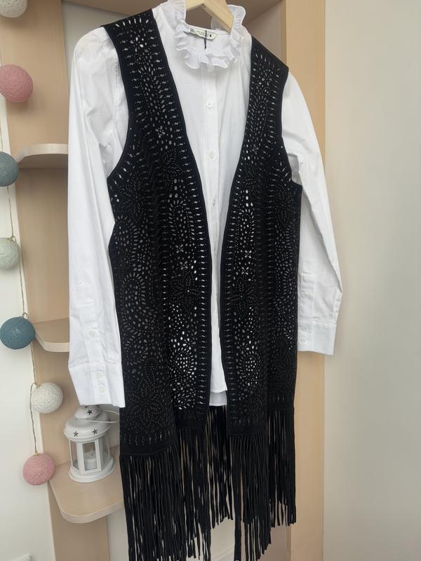 Кожаная жилетка с перфорацией и бахромой Zara, 100% кожаИдеальное состояние, без дефектовРазмер S-M, ориентируйтесь по замерам Длина по спине без бахромы - 72 смДлина с бахромой - 101 смШирина под руками - 46 смТалия - 46 смБедра - 50 см