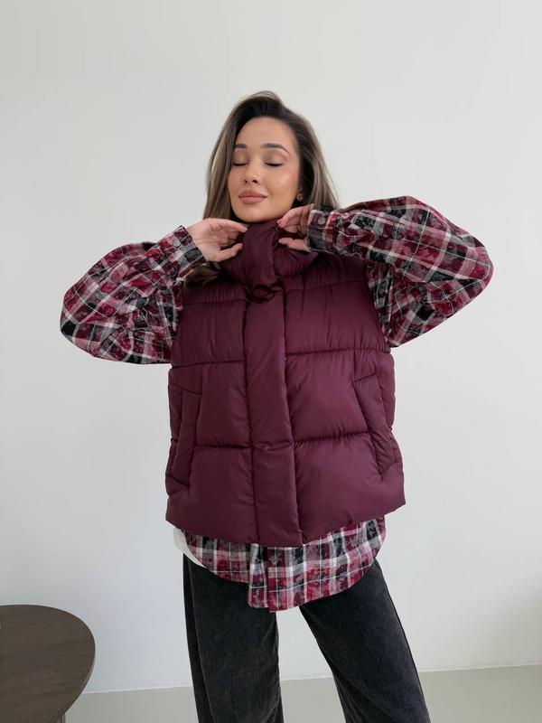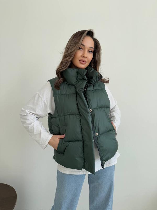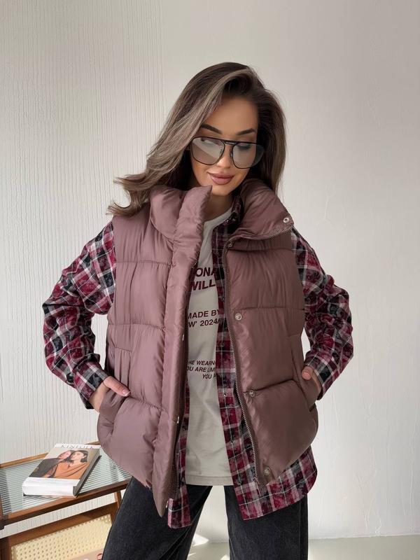 Цвет: белый, молочный, бургунди, шоколад, изумрудный, черный Размер: 42-46, 48-52Материал: матовая плащевка + наполнитель пухКрутежная качественная жилетка на молнии, с стопами, которая позволяет утягивать длину