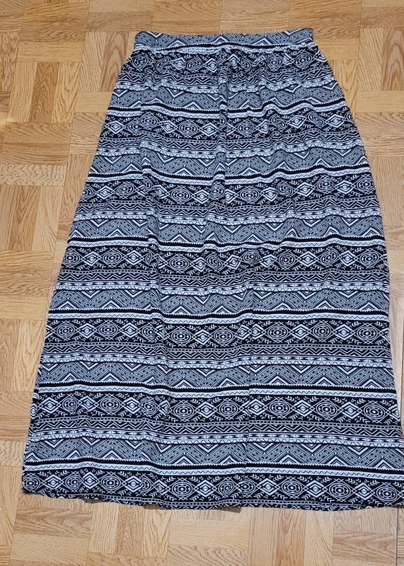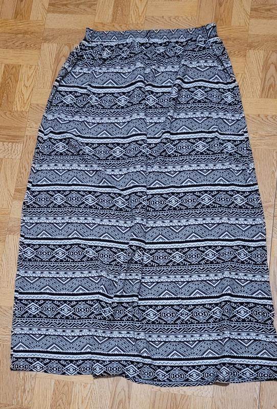Легкая летняя юбка с геометричным принтом. На поясе, сзади вшита резинка. Состояниие новой.Длина 90 см, талия 35-45 см., поб 63 см.