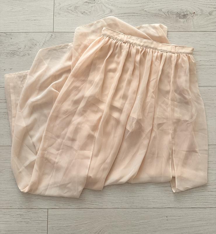 Бежевая длинная юбка с шортами. Есть два разреза спереди и маленький замок сбоку. Есть место для пояса. Замеры: • длина - 106 см. • ширина на поясе - 34 см. • длина шорт - 34 см.