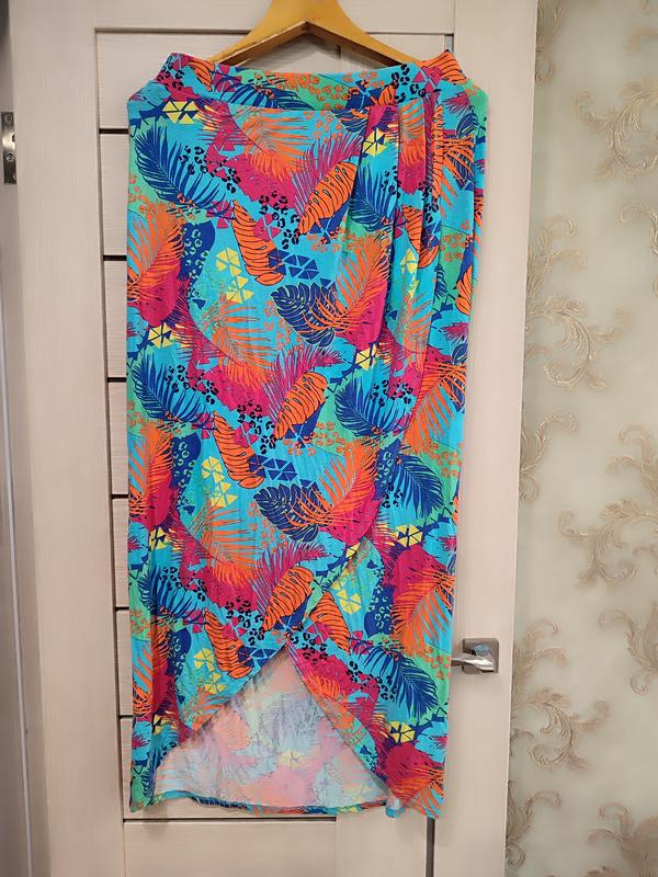 Женская юбка в ярком принте в листья, на резинке от бренда George, размер 16. Ткань вискоза и эластан. Имеет запах спереди, типа разреза на ноге и сборки.