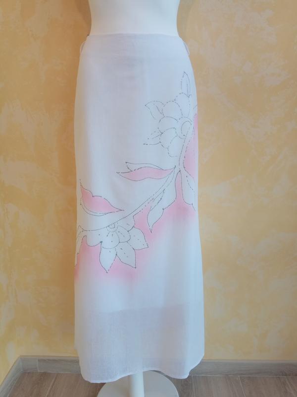 Юбка на подкладке, верхняя ткань "жатка" полупрозрачная с красивым рисунком, выполненным вручную.