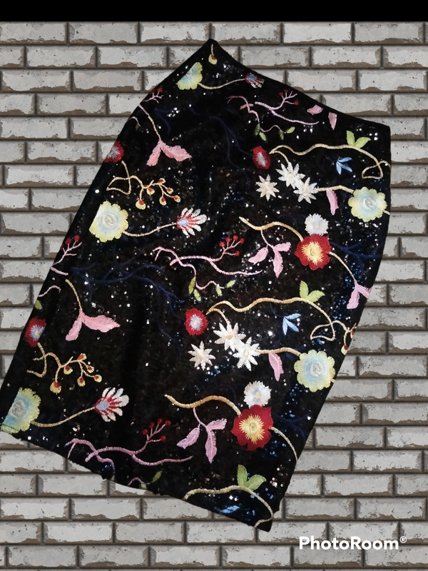Основа полностью черные пайетки, невероятные цветочные сюжеты вышивки шелком.Без вечернего освещения эффект черного атласа с цветами. пот 37 поб 48 Д 70