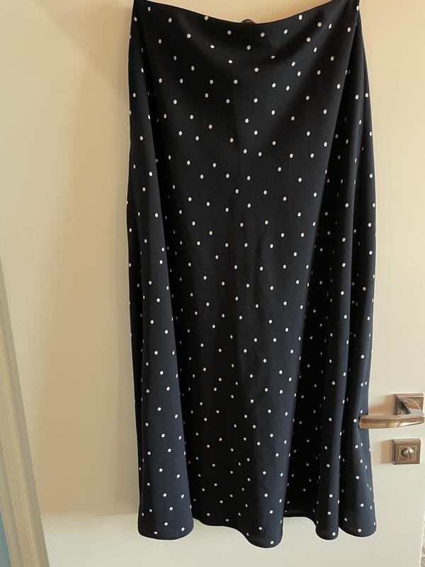 Красивая юбка-миди темно-синего цвета (наблизленный к черному) Стан - 6/5, идеальный. Размер - полномерная L, на ваши параметры т 78- б 100 больше.