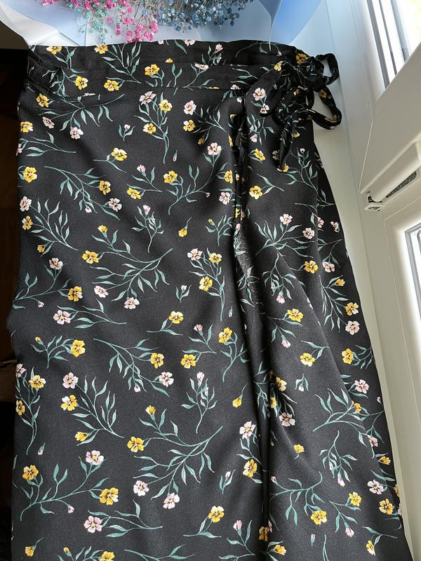 Юбка длиной миды из вискозной ткани. Высокая талия на потайных кнопках с завязками с одной стороны, на запах. Модель с асимметричным нижним краем. Без подкладки.