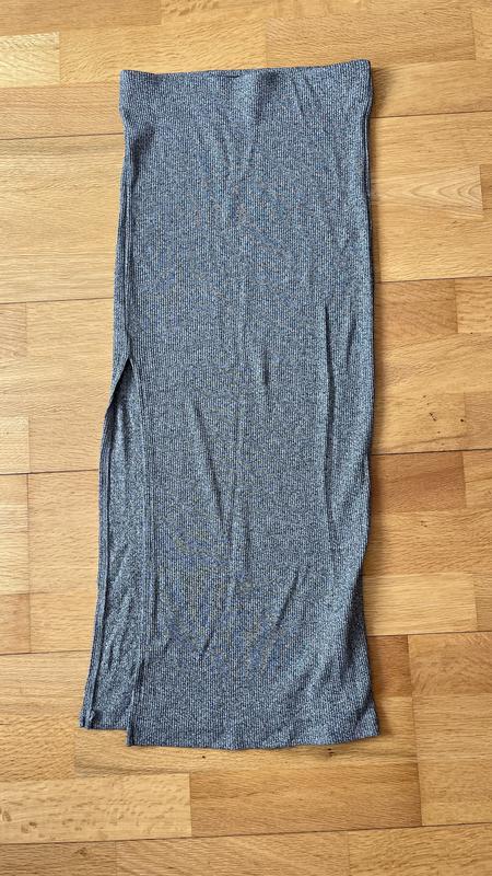 Юбка в рубчик серо-черного цвета на резинке Хорошо тянется и классно садится по фигуре Длина - 81 Длина разреза сбоку - 43
