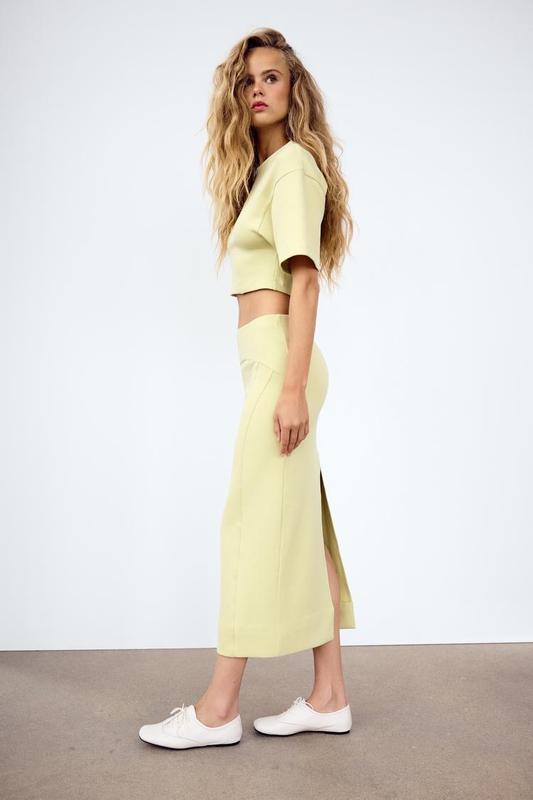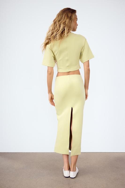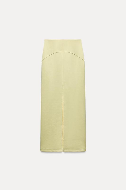 Длинная юбка с высокой посадкой, изготовленная из мягкой эластичной трикотажной ткани с компактным, мягким и непрозрачным переплетением. Эластичный пояс. Разрез сзади внизу.