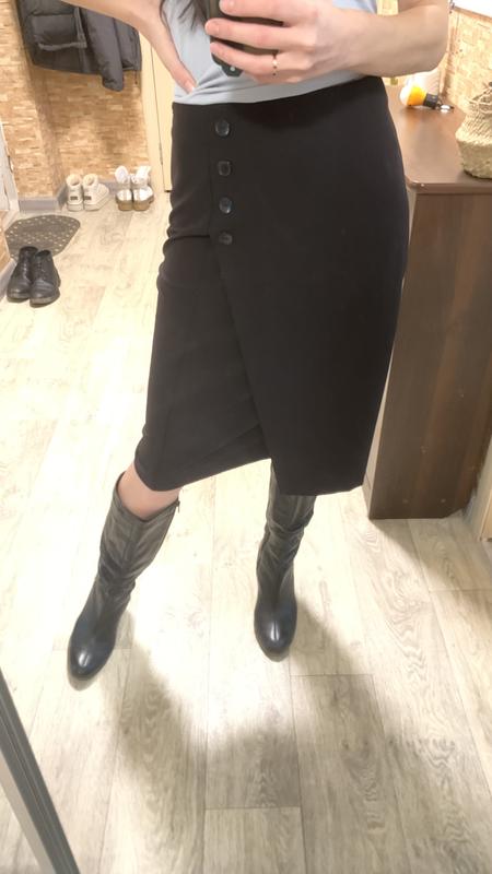 Классическая юбочка с запахом и пуговицами. Очень удобная. Одетая на рост 167, мне чуть за колени. Бирки со складом нет, но на ощупь это тонкая костюмная ткань, немного тянется, поэтому,ансируй, в составе есть чуточку эластана.