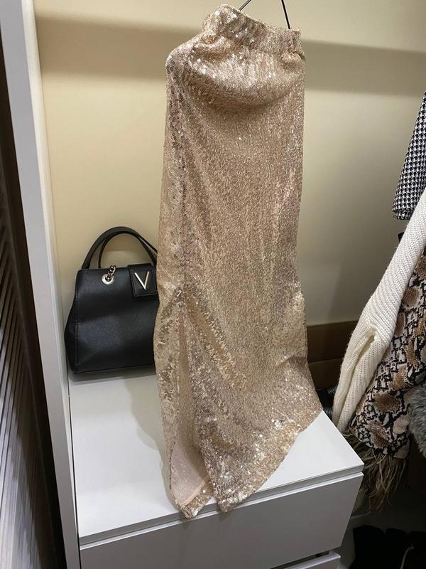 миди юбка в пайетки, в золотом цвете, состояние новой ( одевалась только раз), размер s-m очень удобна и стильна