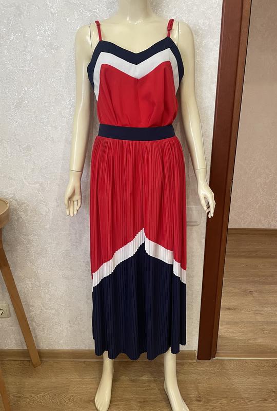 Шикарный комплект из юбки плиссе миди и майки/топа в стиле колорблок!!! Юбка с широким эластичным поясом, указан размер 12, подойдет на M-L-XL-2XL, ориентируйтесь на замеры: Длина - 91 см ПОТ - 35 см (тянется до 46 см) Топ с регулируемыми бретелями, указан размер М, подойдет на S-M-L-XL, ориентируйтесь на замеры: Длина - около 66 см ПОГ - около 45 см Продается комплектом! 27-2