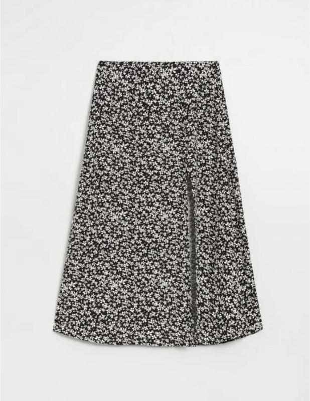 Юбка миди с завышенной талией, узором в мелкий цветок и разрезом для ног. Модель с удобной и незаметной молнией.