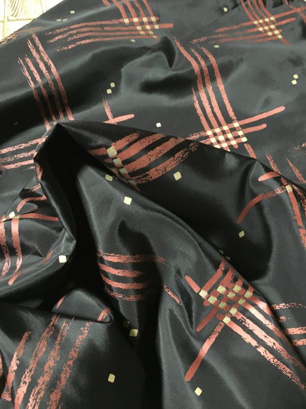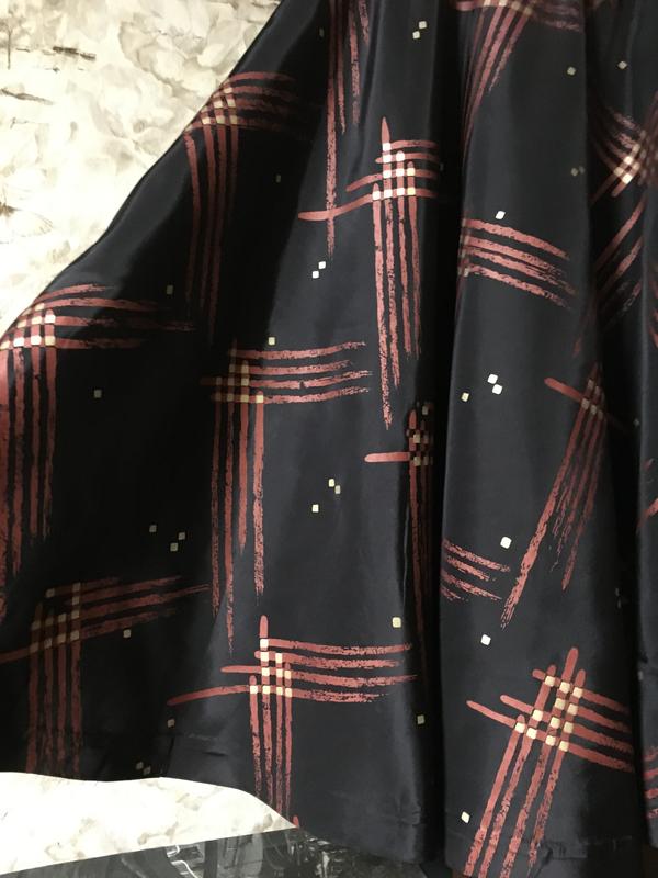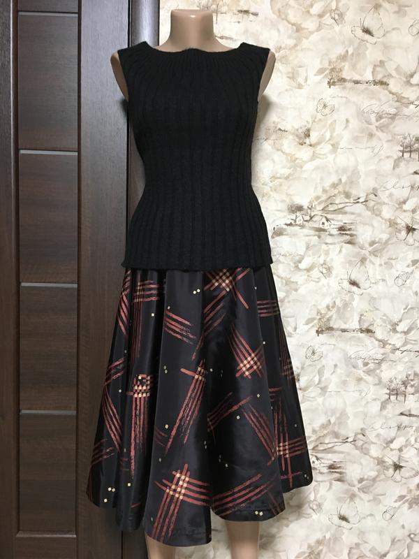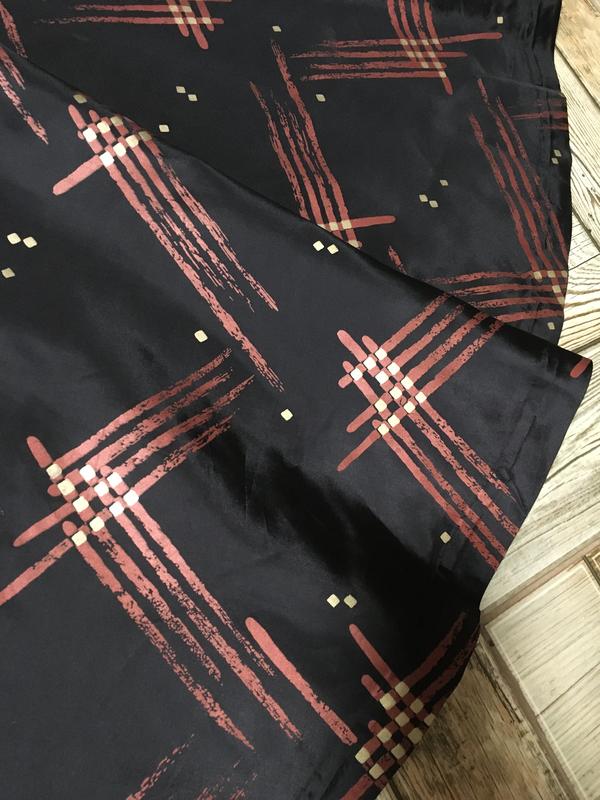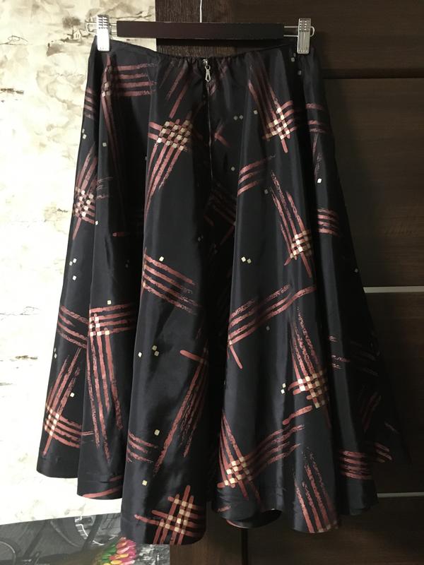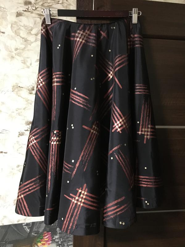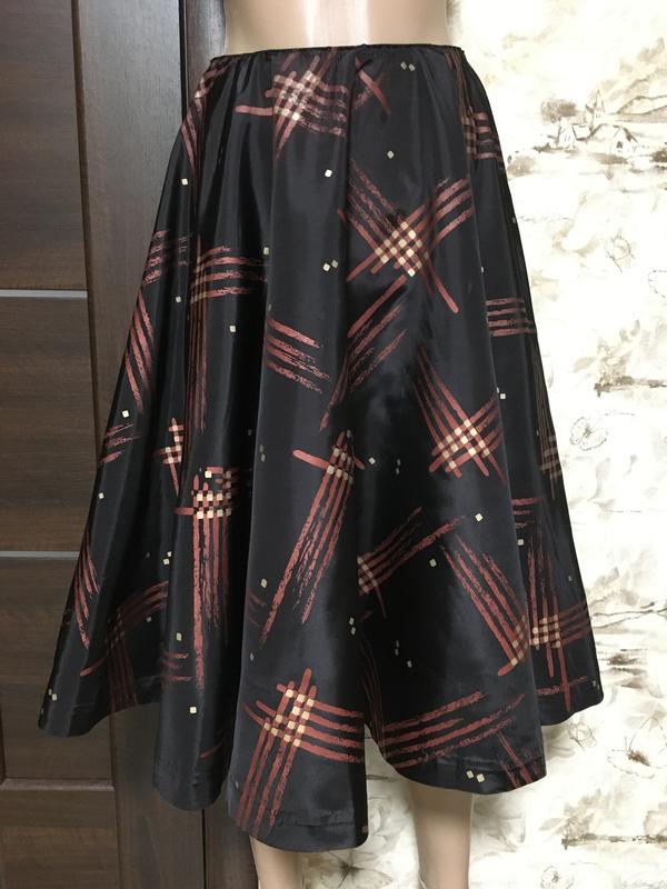 Красивая,неординарная вещь из плотной,слегка шелестящей ткани,держит форму!!Бирок,увы,нет,скорее всего это ацетат !!Дл-66,пот-32-37,поб-абсолютно любой!!