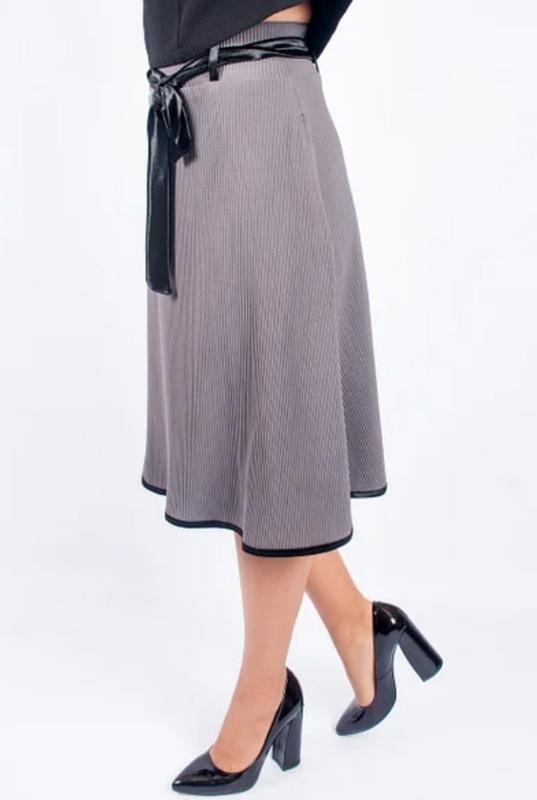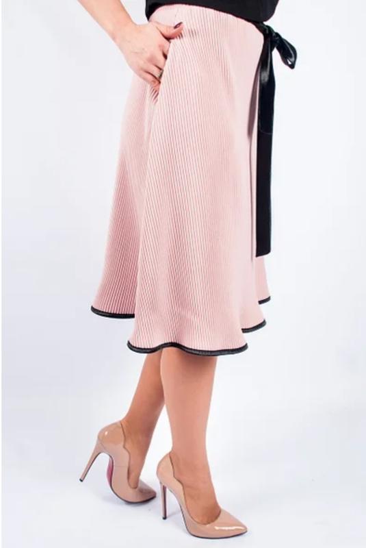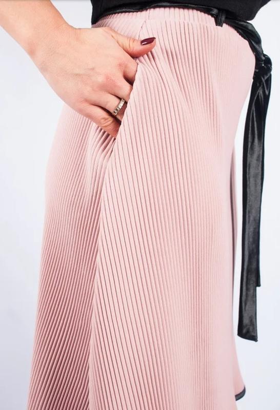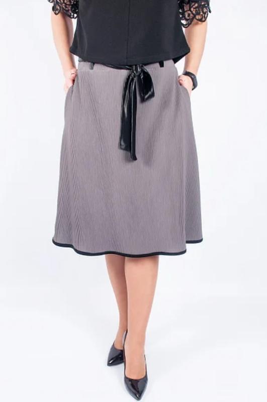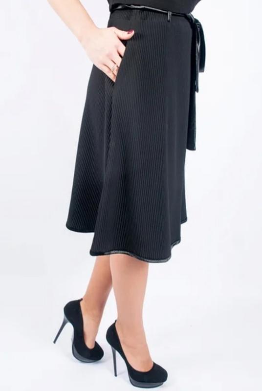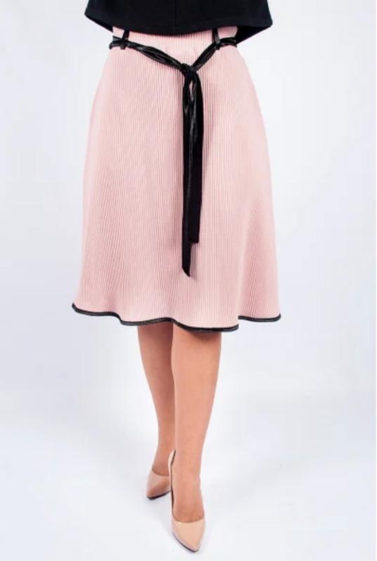 Юбка полусолнце с отделкой. Длина 58 см., ткань плотное гофре. Стильная и романтичная юбка плисе. Модель на резинке с декоративным велюровым поясом. По бокам есть карманы, также есть чёрные лямки под пояс.